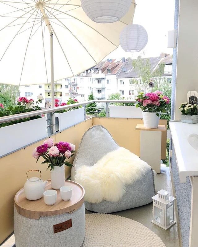 The balcony is decorated with a beach umbrella, as if living in a resort. There are three or two tables and chairs on the balcony. In my spare time, I can read books and drink tea on the balcony to feel the beauty of life.